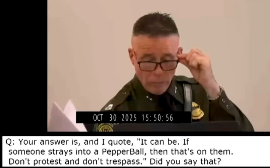But, maybe not nobody. Bovino and hundreds of his agents already skedaddled away from Chicago like rat snakes after Judge Sara Ellis slapped them with an injunction, following Bovino getting caught lying on camera multiple times. And what do you know, the plaintiffs in the Chicago lawsuit say that since then, ICE has gone forth and sinned no more! At least, not legally, in Chicago, in terms of that lawsuit. At least it’s a step up from shooting a praying priest in the eye with a pepper ball?