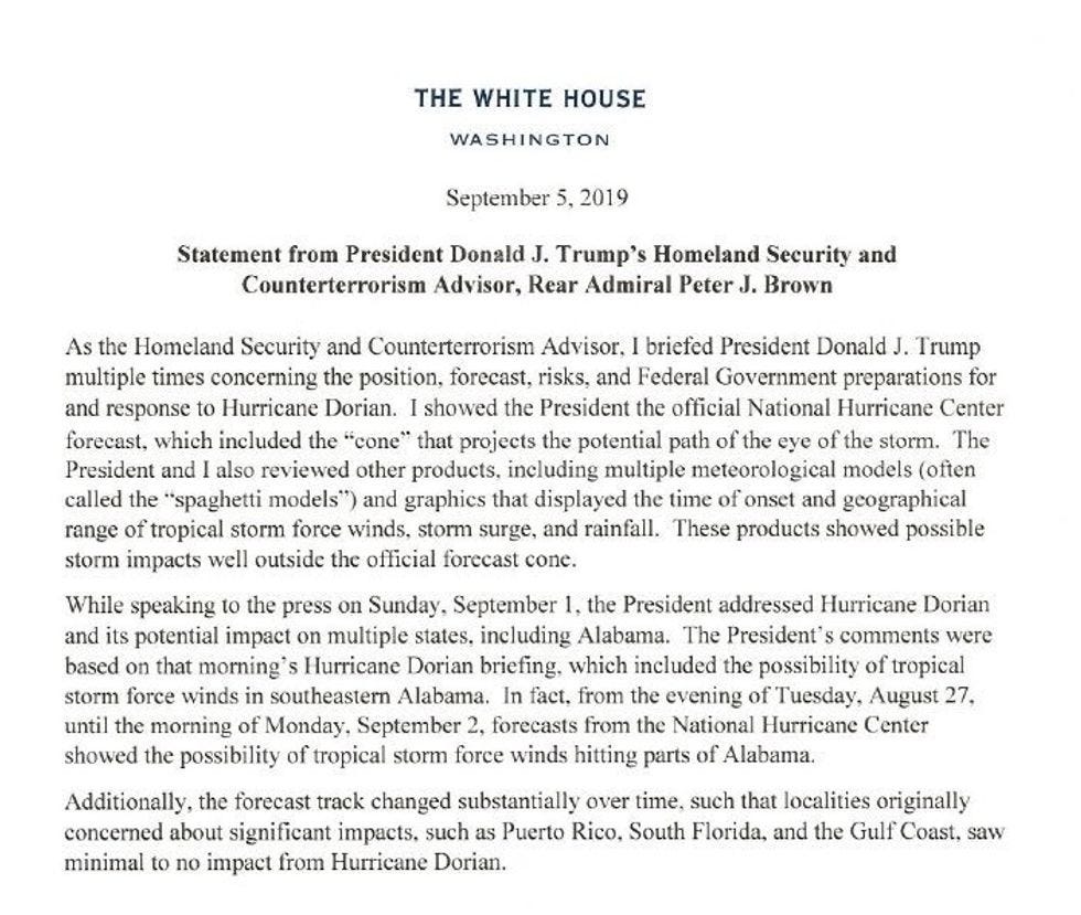 AND THEN! You didn't think he was about to let this go, did you? The fuck you say! AND THEN Trump got Rear Admiral Peter J. Brown, who is his homeland security and counterterrorism adviser, and who is again a god-danged rear admiral , to release a statement saying "Nuh uh! Donald Trump is the real knower of the hurricanes!"