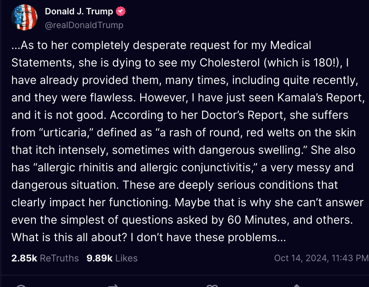 Last night, at almost 1 a.m., Trump started completely losing it over growing demands that he release his medical records, and claiming that Kamala Harris’s seasonal allergies render her unable to perform the duties of president.