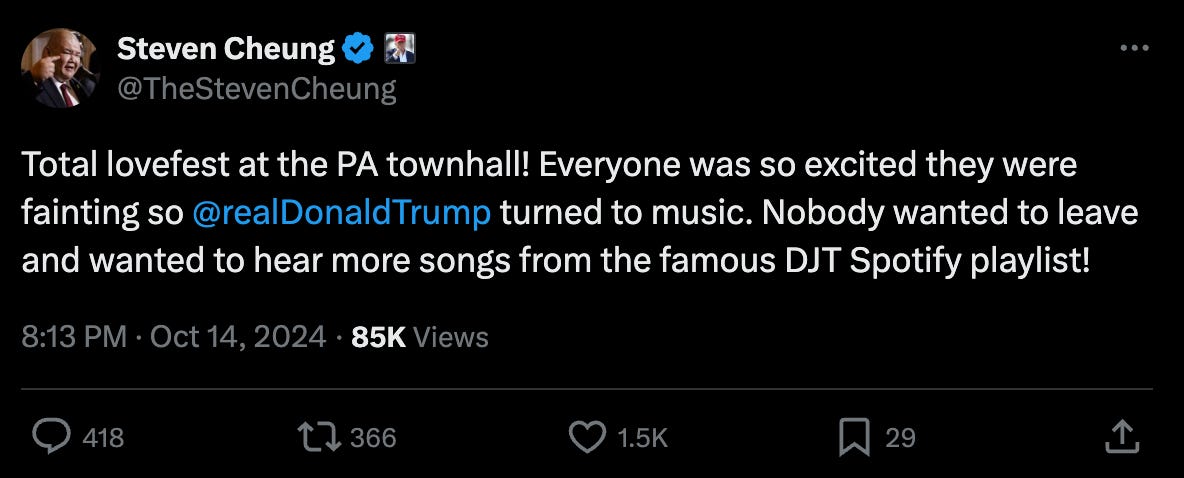 He tweeted, “Total lovefest at the PA townhall! Everyone was so excited they were fainting so @realDonaldTrump turned to music. Nobody wanted to leave and wanted to hear more songs from the famous DJT Spotify playlist!”