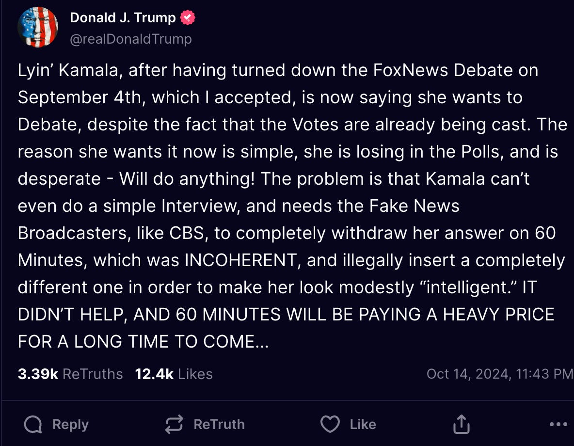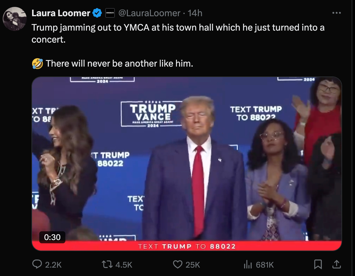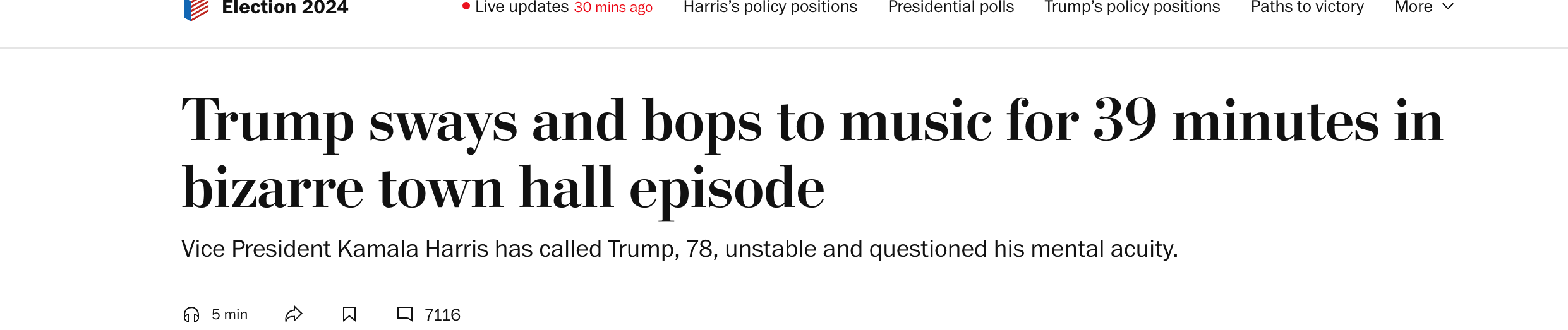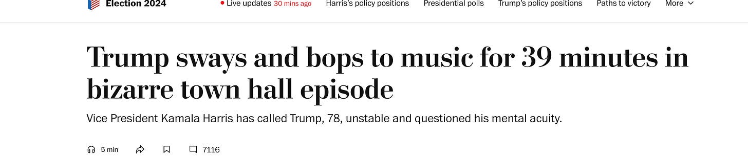 “Trump sways and bops to music for 39 minutes in bizarre town hall episode.” Yes, yes he did. Don’t sleep on that sub-headline: “Vice President Kamala Harris has called Trump, 78, unstable and questioned his mental acuity.” (Don’t worry, the New York Times still fucked it up, calling it an “improvisational departure.”)