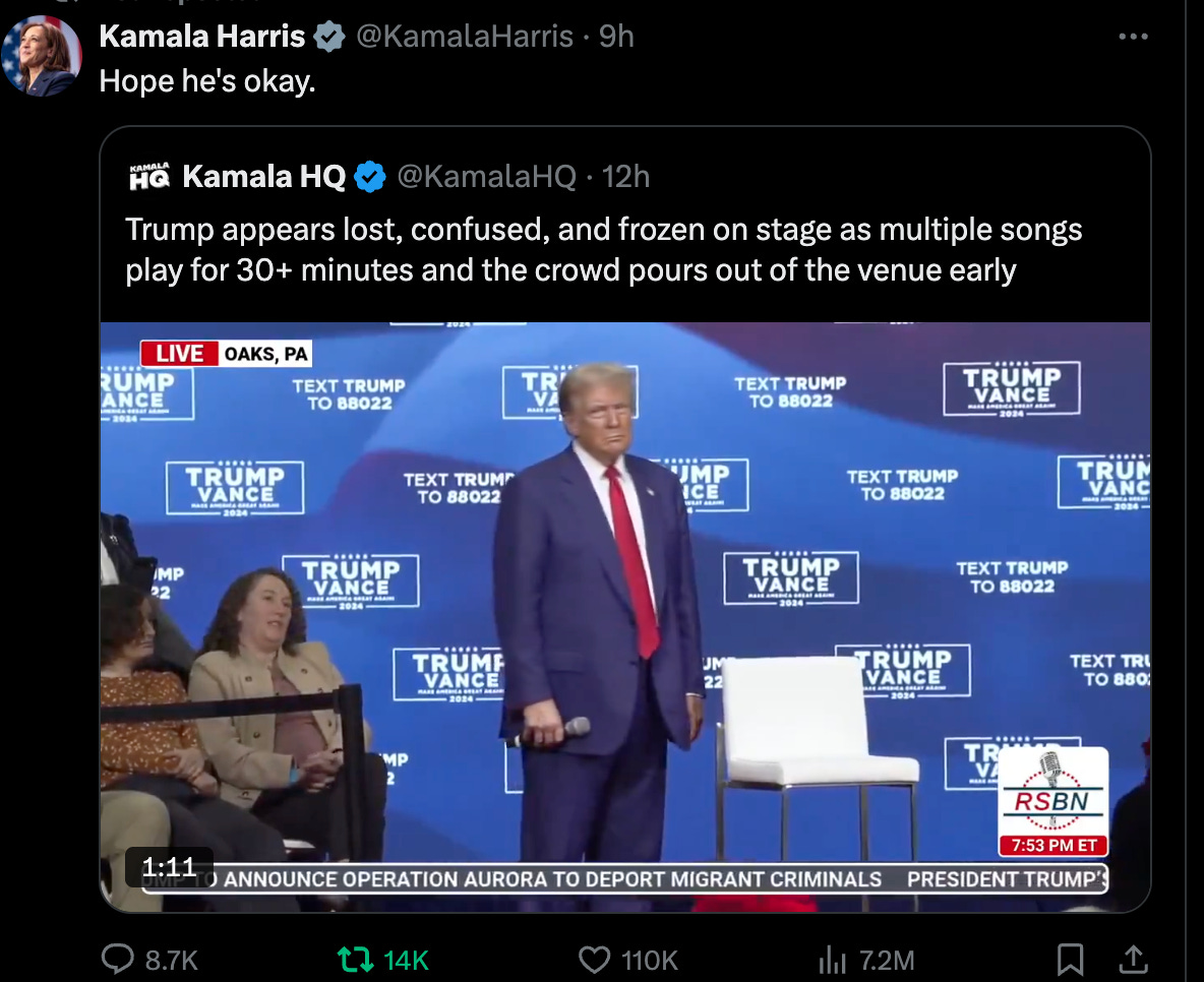 Again, this went on for 39 minutes. The Kamala Harris campaign tweeted, “Trump appears lost, confused, and frozen on stage as multiple songs play for 30+ minutes and the crowd pours out of the venue early.” Harris responded from her personal account, “Hope he’s okay.”
