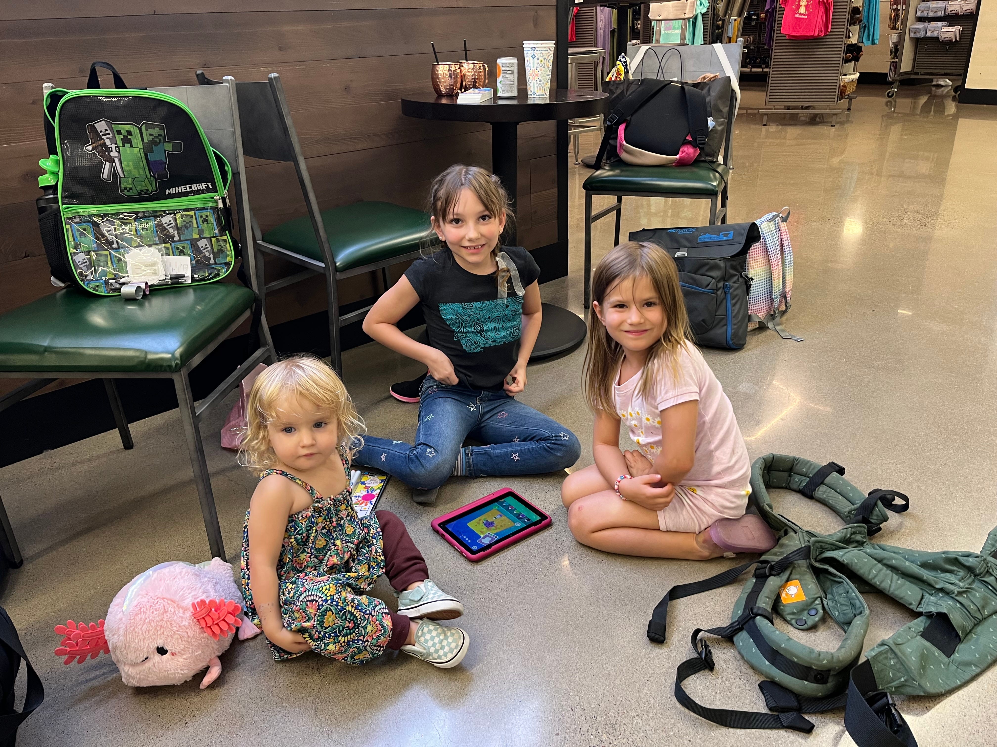 Here is Donna Rose plus two adorable new friends in the airport where we all sat for 9 hours while United fixed its broken tire and then timed out the flight crew and then got us to Denver at 1:30 am and to Detroit in steerage a full day later, and now it’s two days later and I’m still wrecked. One cool thing: after an hour, the pilot announced we had the right to deplane should we so choose, thanks to Mayor Secretary Pete’s Passenger Bill of Rights. (He didn’t explain it was thanks to Mayor Secretary Pete.) So that’s a fabulous change!