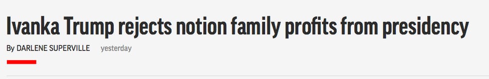 The president's daughter and White House Adviser to Gross Nepotism, Ivanka Trump, gave an interview to the Associated Press yesterday. It was full of lies and slander. Ivanka opposes her father's impeachment because her lawyers inform her she'd also have to leave if he's removed from office. She can't go back to "designing" crap clothing. Shewon't go back.