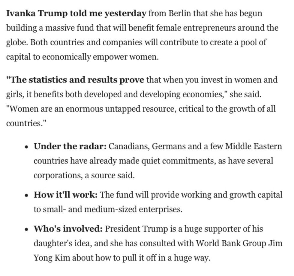 Wait, she is amassing money from Canadians, Germans and even MIDDLE EASTERNS? Didn't we have to spend the campaign constantly listening to attacks on the Clintons for taking money from corrupt and retrograde Middle Eastern regimes, money they used to foster equality and women's rights around the globe? Yes, we did! Maybe Ivanka is doing that too! Or maybe she is just grifting, now that she has been forced to "give up" her multi-million dollar fashion empire and live like a common pauper who works at the White House. As Josh Marshall asks, is she going to make money off of this? Will she be able to use her profits to buy all kinds of adorable swim trunks for Jared, who is also slumming it by being the guy who actually runs the country for his father-in-law?