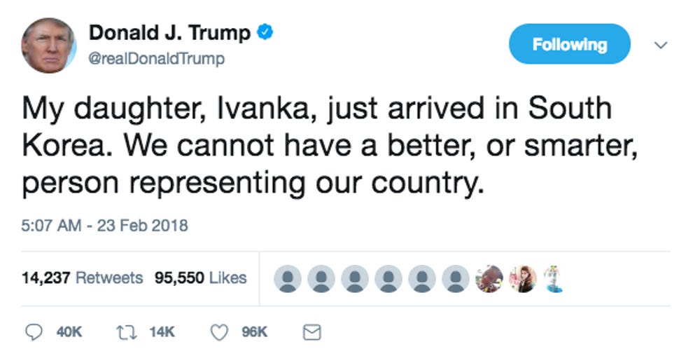 Ivanka Trump, who still has no permanent security clearance, was conducting nuclear diplomacy on behalf of the United States. Ivanka Trump, who licenses her name to shitty clothes and is the pretty face of her father's money-laundering condo businessALLEGEDLY. In a country where we have no ambassador because the White House nixed the competent guy who told them a "bloody nose strike" on North Korea was a ridiculous idea.Cool, cool.