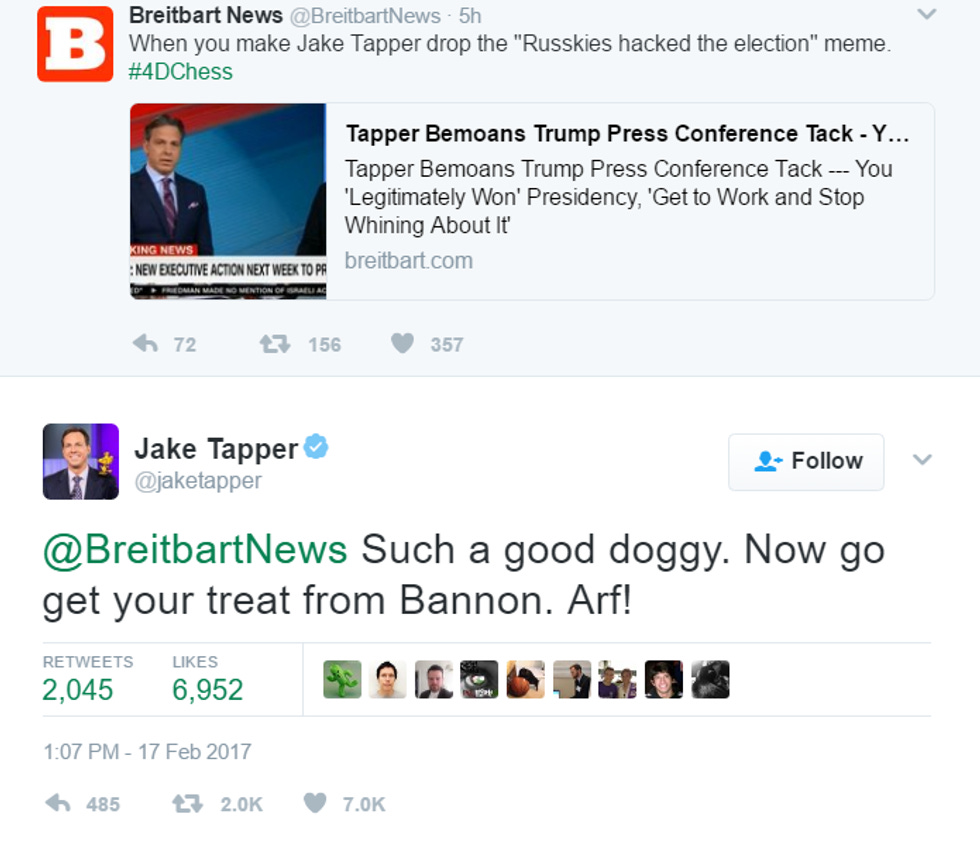 What's that all about, you might be a-wondering? Well, Breitbart had a GOTCHA! article about how Jake Tapper said Trump was "legitimately" elected, which therefore means there was no hacking and Donald Trump doesn't have cybersex with Vladimir Putin every night, HA HA CAUGHT YOU LAMESTREAM MEDIA DUMB DUMB ADMITTING TRUMP'S VICTORY WAS YOOGE! It came in response to that amazing moment during Trump's Thursday press conference, when Trump claimed he had the biggest electoral college victory since Reagan, which is HILARIOUSLY WRONGSTUPID. If you didn't see it, watch as nice NBC reporter Peter Alexander explains to The World's Dumbest Puppet that he is lying. Alexander goes HARD, and this is how all reporters should do when Trump lies: