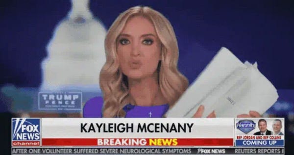 McEnany has upped her lying game with her straight-faced insistence that Trump actually won the election we all saw him lose. She's appeared on TV, holding up pieces of paper marked EVIDENCE, and has repeatedly broken the ninth commandment while ostentatiously wearing a cross. As she explained to the Daily Caller, it's the “very least" she can do for Jesus. Indeed.