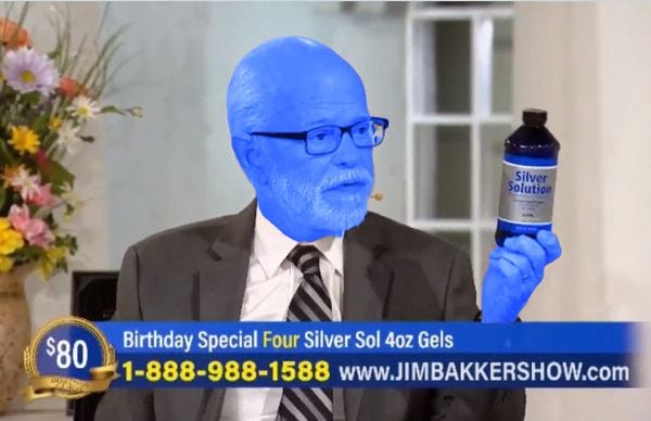 Which is why fans of quackery say THEY don't want you to know the truth about silver's miraculous health benefits that don't actually exist. And why Jim Bakker will happily sell you the stuff in various amounts, from the 21-pack of throat lozenges for only $80, to the great big case of 12 16-ounce bottles for a mere $300. It must be good, because look at this cleansing immunobabble. This stuff engoodens your "immune system"