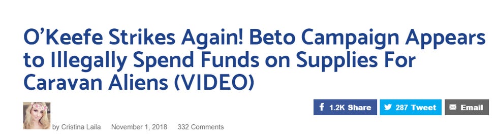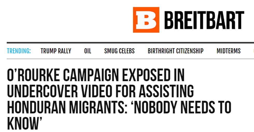 Ted Cruz's "basic Q" about Beto funding people crossing the border illegally is invalid, as it isn't even remotely suggested in the O'Keefe video. But, to be completely fair, Ted Cruz might be too busy jerking off into empty soup cans to watch O'Keefe's 23-minute video. He probably just saw headlines like these: