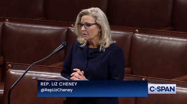 So let's give credit where credit is due: Liz Cheney has shown remarkable courage, bucking her party's insistence on creating an alternate universe in which Donald Trump won the 2020 election, only to be thwarted by a massive yet undetectable fraud. She got booted out of leadership and will likely lose her congressional seat, but she's not backing down. Mad props .