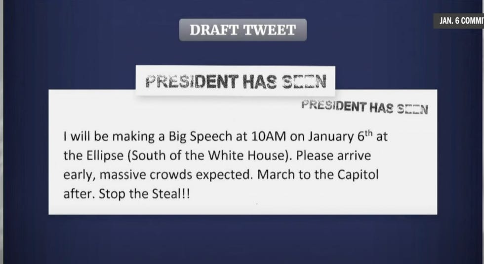 This is an undated draft of a tweet Trump's team wanted to send out about the march on the Capitol after the rally. "Please arrive early, massive crowds expected. March to the Capitol after. Stop the Steal!"
