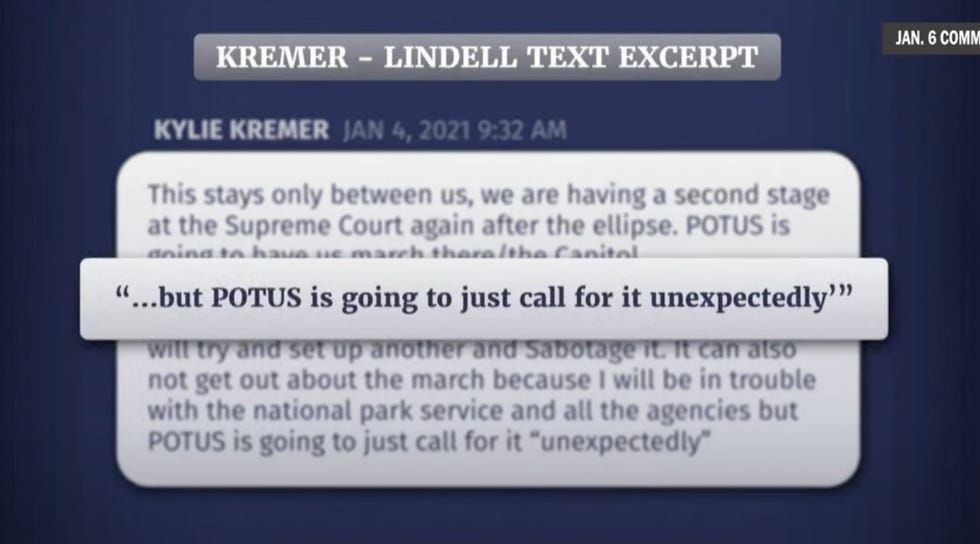 Here's a January 4 text from Amy Kremer to Mike Lindell, the Pillow weirdo, telling him there will be a march on the Capitol after the rally on the Ellipse.