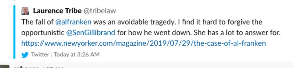 Mayer's portrait of Franken is simultaneously that of a poor bastard "no one wants to hear from again" and someone frequently stopped on the street and told he shouldn't have resigned. That's not the "tragedy" Laurence Tribe was lamenting before he deleted his tweet. It's the end of Dead Poets Society . Franken believes he could've "countered the narrative aired in the press" if he'd appeared before the Senate Ethics Committee. (Republicans run the Senate, by the way, and would've delighted in torching him.) And some might think Gillibrand forced Franken to resign prematurely, but if she has that kind of power, she ought to try it out on Republicans. Start with the senator from Kentucky! (Either of them, really.)