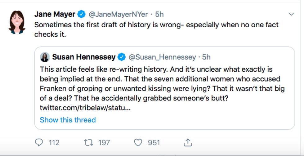 It's so strange to see #MeToo described as this force of nature that's destroying powerful men. This type of phrasing humanizes the accused men while depersonalizing the accusers. Mayer does go into great detail about Leeann Tweeden, who accused Franken of sexual misconduct during a 2006 USO tour, but she gives Tweeden the full Mollie Hemingway treatment: She's a conservative! She's willingly appeared on Sean Hannity's show!