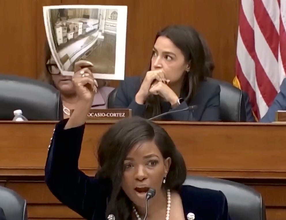 She is excellent at making a viral clip, a necessity these days. She first came to our attention around September 2023, when House idiots were trying to impeach Joe Biden over loving his son too much, and she brought up OUR NATIONAL SECRETS IN TRUMP’S SHITTER instead.
