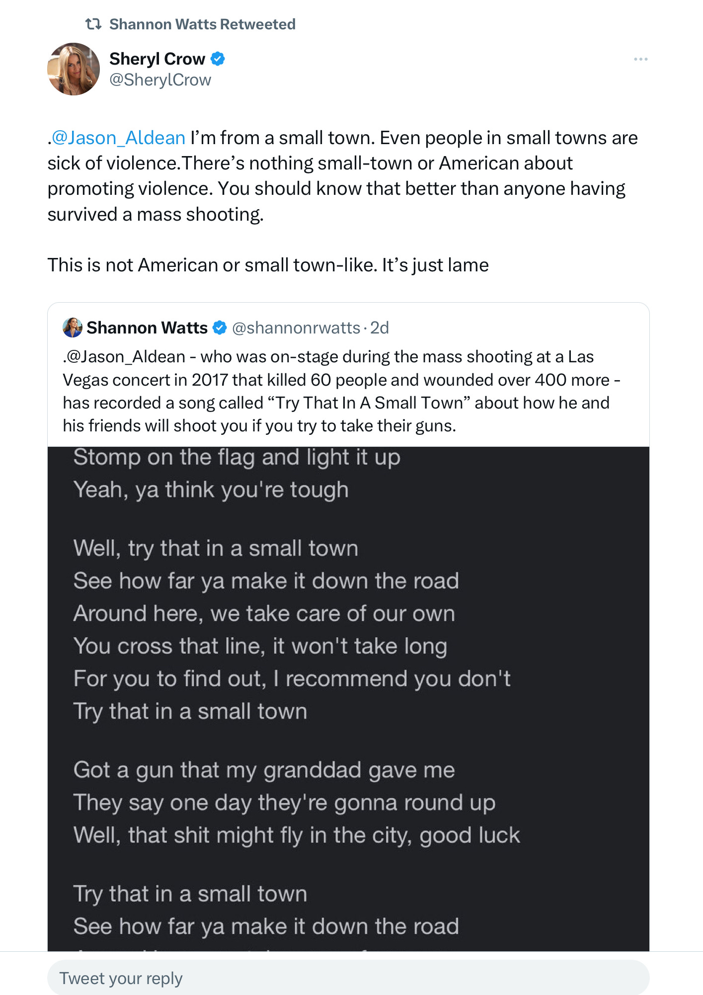Nashville resident and actual musician Sheryl Crow tweeted Tuesday, “I’m from a small town. Even people in small towns are sick of violence. There’s nothing small-town or American about promoting violence. You should know that better than anyone having survived a mass shooting. This is not American or small town-like. It’s just lame.”