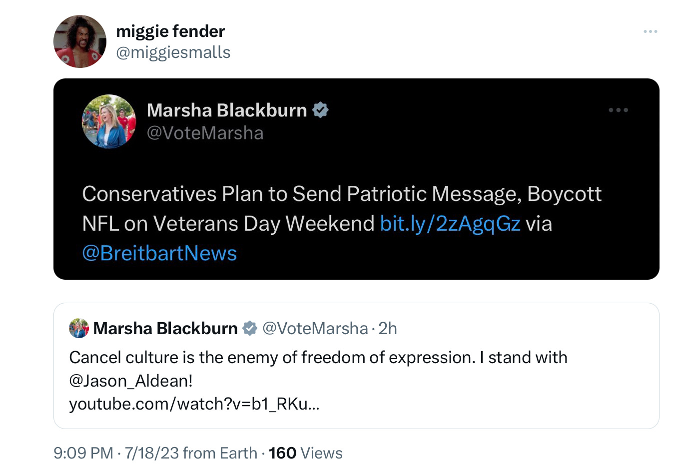 Maintaining her spotless record of always being wrong about everything, Sen. Marsha Blackburn of Tennessee defended Aldean and claimed he’d been “cancel cultured,” which is right-wing speak for “public criticism of a public work.” These are the same people who bullied Dylan Mulvaney because she drank Bud Light while trans.