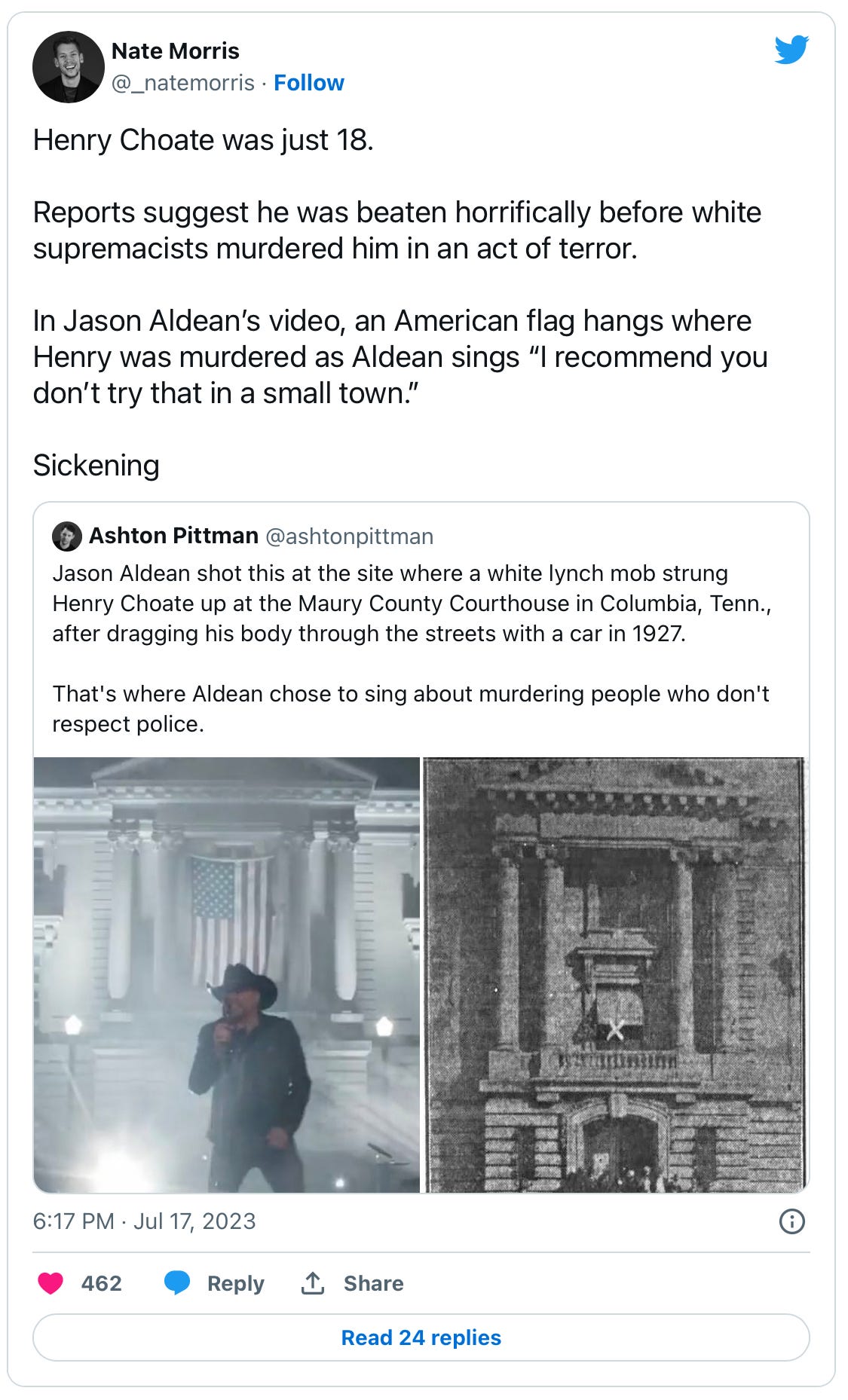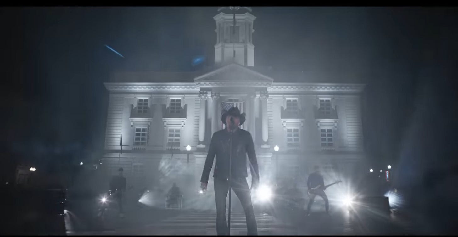 The video was almost comically offensive. Aldean appears in front of a Tennessee courthouse with the flag behind him. It is the US flag, not the Confederate, so that’s something at least. However, according to Ashton Pittman at the Mississippi Free Press, this is also the site “where a white lynch mob strung Henry Choate up at the Maury County Courthouse in Columbia, Tennessee, after dragging his body through the streets with a car in 1927. That's where Aldean chose to sing about murdering people who don't respect police.”