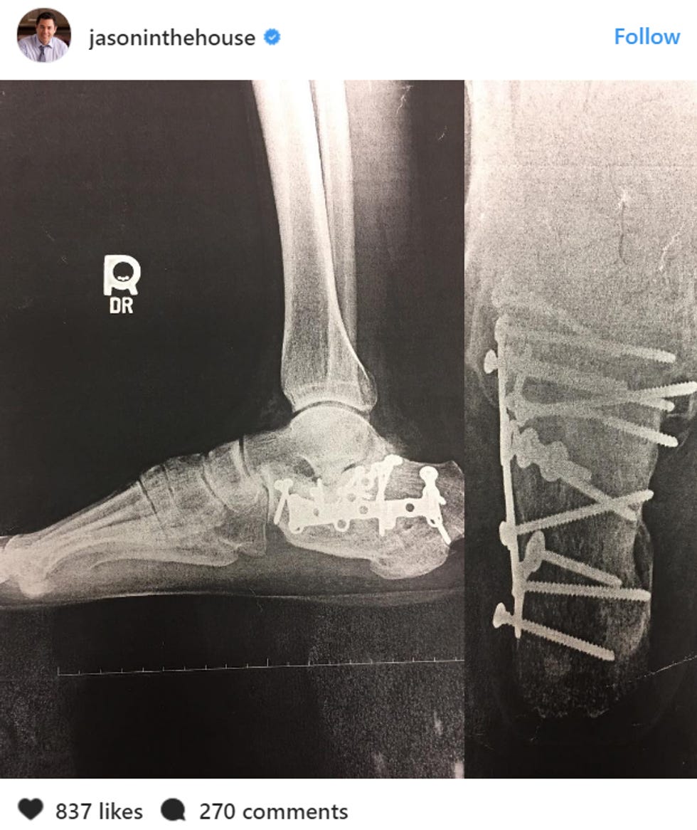 If you cannot read that, the gist is that 12 years ago, Jason Chaffetz was trying to fix his garage door or something and he fell andthat's why his face looks like thathe broke his foot in a million places. Now his doctors say they need to take all the nails out of his foot RIGHT NOW, otherwise he will get a big infection. He appreciates his "constituent's patience" (apparently just the one), and he promises he will come back to work at Congress ASAP, when his foot is beautiful and new again.