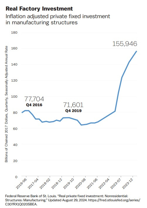 That’s just one of several points in the 74-page policy document the Harris campaign released last week (when the New York Times was falsely saying Harris’s policies lacked substance). Here, have a happy little chart from page 55, based on Federal Reserve data. Since the passage of the Bipartisan Infrastructure Act, the Inflation Reduction Act, and the CHIPS and Science act, we’re building new manufacturing capacity like crazy: