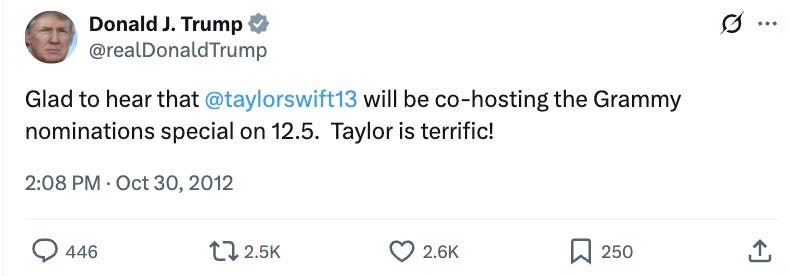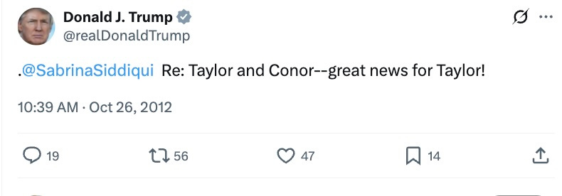Also once-appreciative, noted perver upon younger women Donald John Trump, who in 2012 took to his Twitter to weigh in on the subject of her dating Conor Kennedy, a very normal thing for a man in his 60s to be thinking and Tweeting about, and to gush how happy he was that she would be co-hosting a Grammys nomination special.