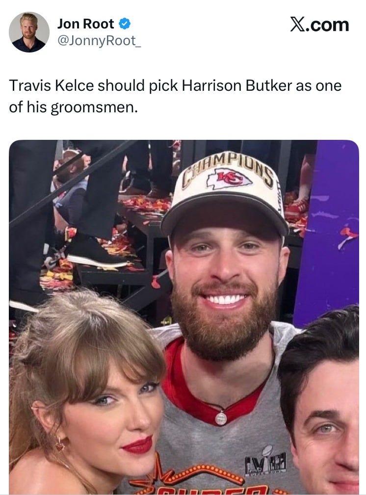 No comment from Kelce’s teammate/Kansas City Chiefs kicker/evangelical beardo weirdo Harrison Butker yet, you know, that shitass tight-pants guy who had the gall to go to a Catholic college run by the Benedictine sisters of Mount St. Scholastica (literally) and try to set all of those nuns and graduating ladies straight that the highest calling from God is to be a wife and mother. Then he lectured them that priests were getting too chummy with the laity, quoting Swift’s song “Bejeweled” in the most awkwardly wrong-context kind of way: