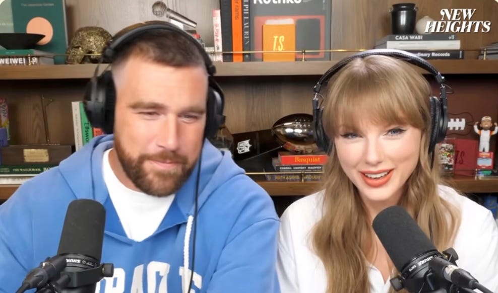 Anyway, here’s future brother-in-law Jason Kelce hyping her up, and her whole adorable podcast appearance to announce her 12th album, right before she and Travis got engaged. Look how sweet and in love those two are, a matched pair of hammy goofballs! Some good tips to woo a woman in there too, boys!