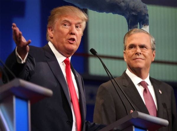 We're actually having a difficult time getting our heads around the latest Donald Trump/Jeb Bush spat, which slammed into the 2016 GOP primary contest Friday with the force of a hijacked 767 full of jet fuel, when Trump suggested that George W. Bush didn't keep us entirely safe during his presidency, seeing as how the 9/11 attacks occurred while he was president. In an interview with Bloomberg News , Trump said that he would be more competent than anyone else, for a certain value of "competence" at least, adding, "When you talk about George Bush, and say what you want, the World Trade Center came down during his time." Interviewer Stephanie Ruhle gave Trump the chance to back away, saying, "Hold on, you can't blame George Bush for that." Trump danced around the question of responsibility, but was quite certain about the chronology: