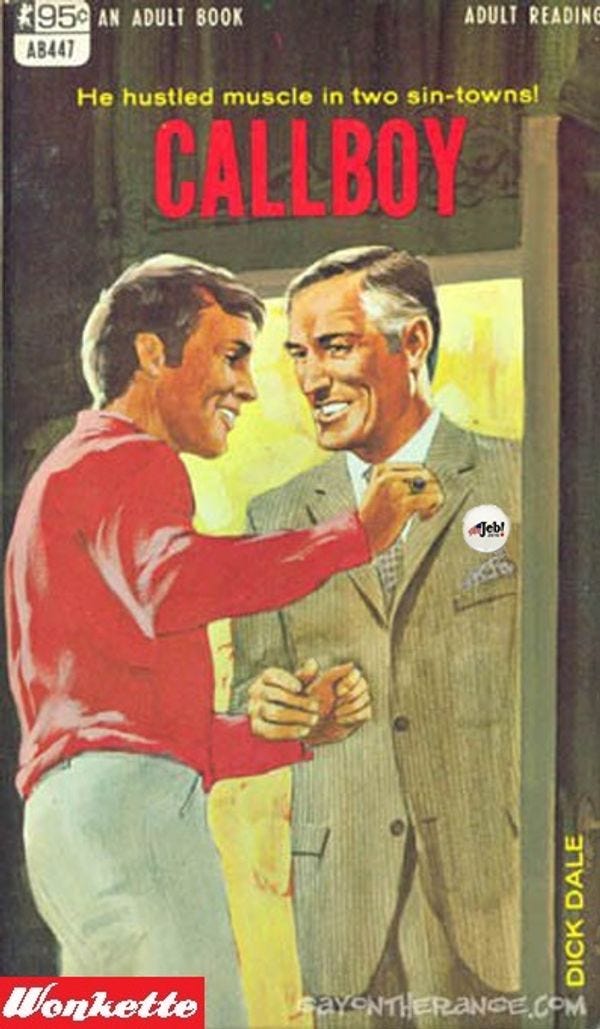 Now, as far as we can tell, no one's reacting to Jeb's little foe paw with anything like a similar level of indignation, even though it has the added implication of homosexxical sexing. This is possibly because while Barry Bamz is legitimately sexxy and therefore a threat to the honor of white virgins everywhere, no one can imagine anyone -- straight, gay, or anime fan -- lustfully panting to Jeb, "Take me now, you magnificent stallion!" Instead, the reactions ran more along these lines: