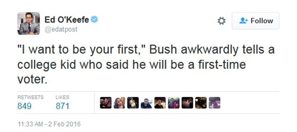 [contextly_sidebar id="6pF7Yq7gapCIG55ntENPNdGDd3DC7J4y"]After performing well below even his own pitifully low expectations in the Iowa caucuses and spending roughly $2,884 for every one of the pitifully few votes he won there, Jeb! Bush continued on to New Hampshire, where he headed straight for the platform where the Awkward Train was boarding. Or maybe not that straight after all: In an effort to be hip and with it, in the casual vernacular that so many of the young folk are "into" these days, Jeb went with an awkward double-entendre to try and woo a first-time voter in the Granite State, according to WaPo reporter Ed O'Keefe: