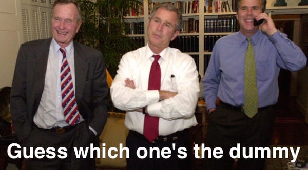 Sure, we could point out that despite his phony distancing himself from his family earlier in the campaign, Jeb has always been running as a legacy candidate, with a team of advisers he inherited from Daddy and Big Brother . We could also fact-check Jeb's claim that the former Presidents Bush were "good presidents," on account of how Daddy was a one-termer whose greatest accomplishment was listening to Colin Powell (Powell Doctrine, drink!) and Dick Cheney tell him full-on war in Iraq would be the dumbest fucking thing any president could ever do, only to hand off Powell and Cheney to Junior, so they could show him how to do the dumbest fucking thing any president could ever do. The dumbest fucking thing, by the way, that Jeb also would have done, even knowing what we know now (and also knew at the time, cough cough), except that no, never mind, scratch that, his advisers tell him he wouldn't have done the same thing after all.