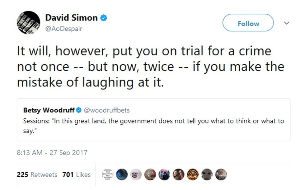 And it really is nice to see Sessions taking such a strong stance in favor of freedom of speech. Of course, you can't expect him to go too far with that sort of thing: