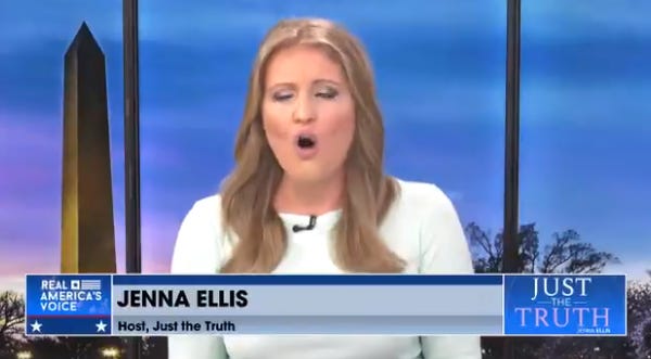 Well last night, Jenna Ellis went on her batfucking crazy show and dramatically quit the GOP, unless Ronna McDaniel quits. And why? Because — Jenna Ellis's words! — "the truth matters." Watch it, it is hilarious: