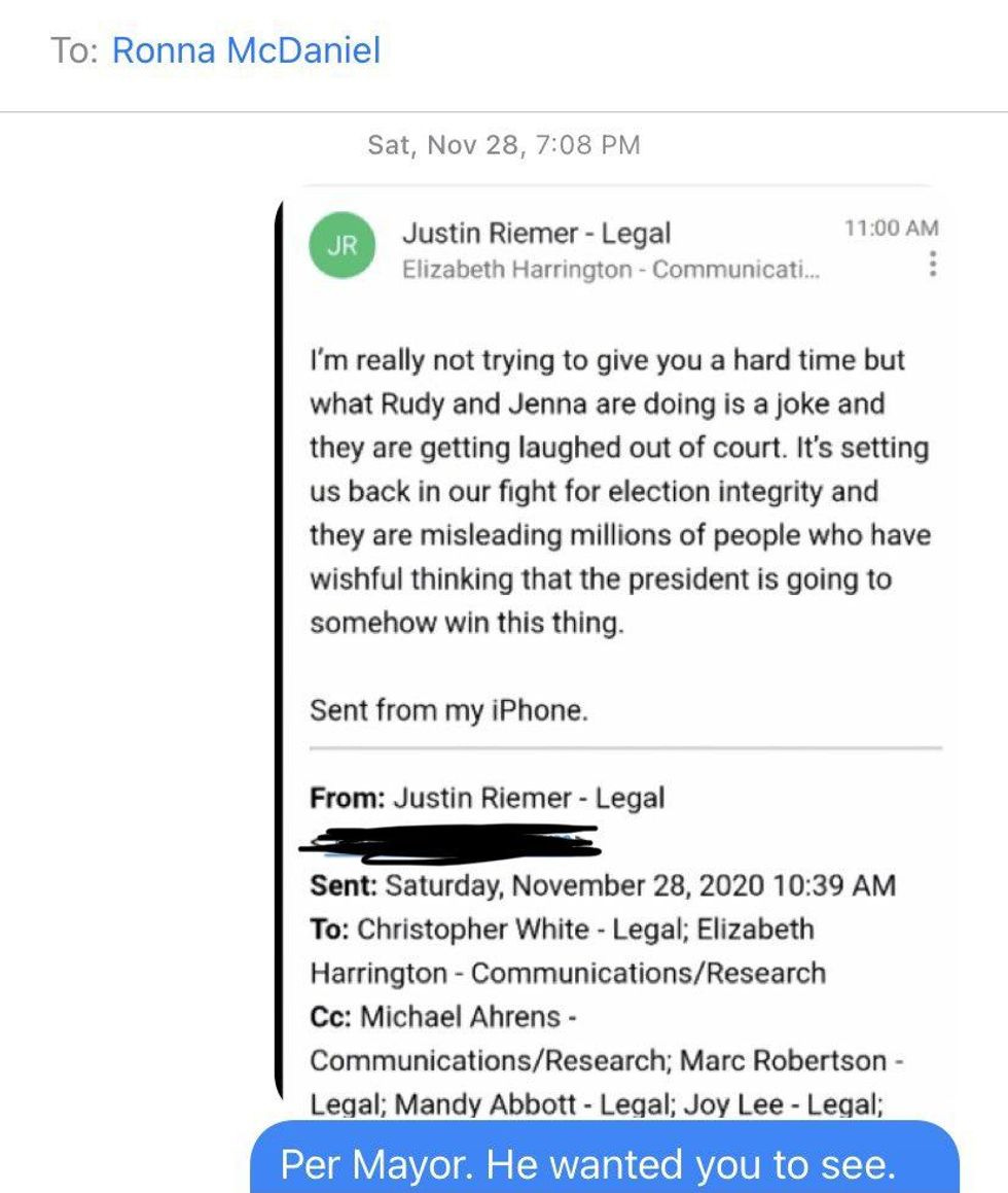 "What Rudy and Jenna are doing is a joke and they are getting laughed out of court," Riemer, a longtime Republican lawyer, wrote to Liz Harrington, a former party spokeswoman, on Nov. 28, referring to Trump attorneys Rudolph W. Giuliani and Jenna Ellis. "They are misleading millions of people who have wishful thinking that the president is going to somehow win this thing."