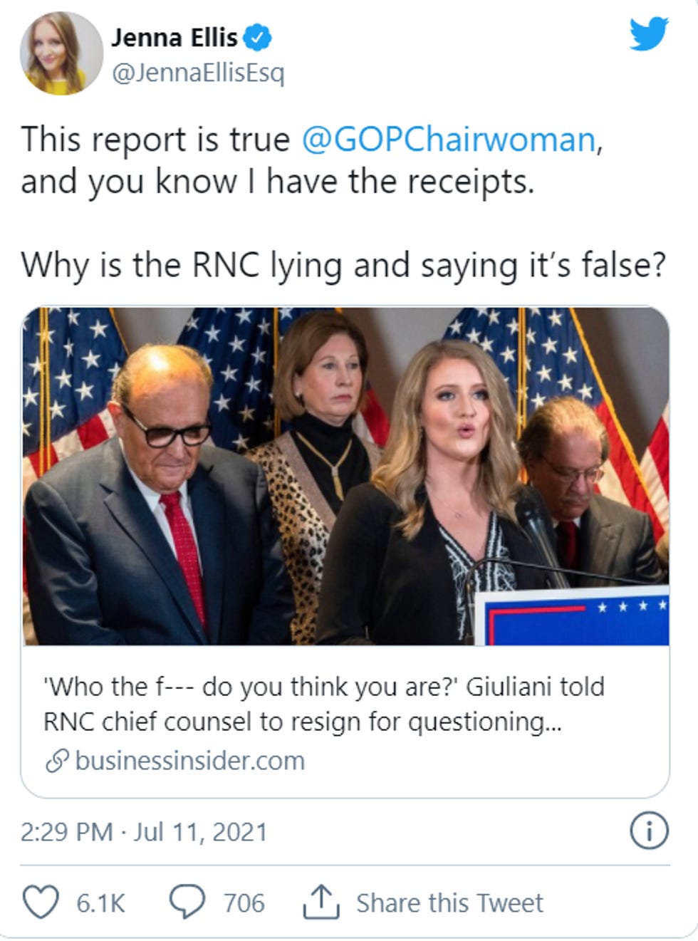 People like Jenna Ellis are very mad at RNC head legal counsel Justin Riemer. His sin? Saying the truth back in November about all the batshit Rudy Giuliani and Ellis and the Kraken lawyers did after the election, traipsing through courtrooms and landscape company parking lots to try to steal democracy for their Dear Leader.