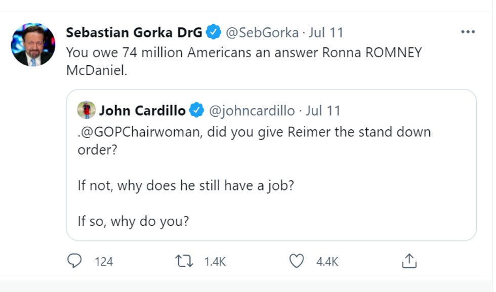 Indeed, back in November, Rudy 'n' Jenna tried to get Riemer fired for saying these thoughtcrimes about how Rudy 'n' Jenna are a big bucket of clownfarts lying to millions of idiots and making them believe their lord and savior Jesus H. Trump would ultimately win back (steal) the election. The RNC did not fire Riemer. He still very works there.