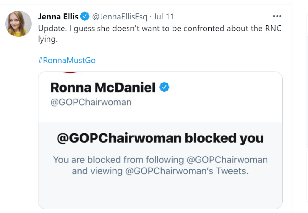 Gather 'round, children, for Trump idiot lawyer Jenna Ellis is showing her ass in the world's most hilarious way right now, and she's trying to get Ronna Romney McMarriedName fired from the RNC in the process. And WE get to watch these people eat each other's heads off.