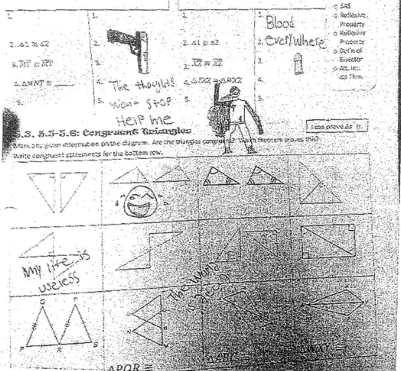 On the very day of the shooting, the Crumbleys were called into the school to discuss some disturbing and violent drawings Ethan Crumbley had made in geometry class — such as a drawing of a gun along with the text “The thoughts won’t stop. Help me,” a picture of a bullet with the text “blood everywhere” and the text “my life is useless.”