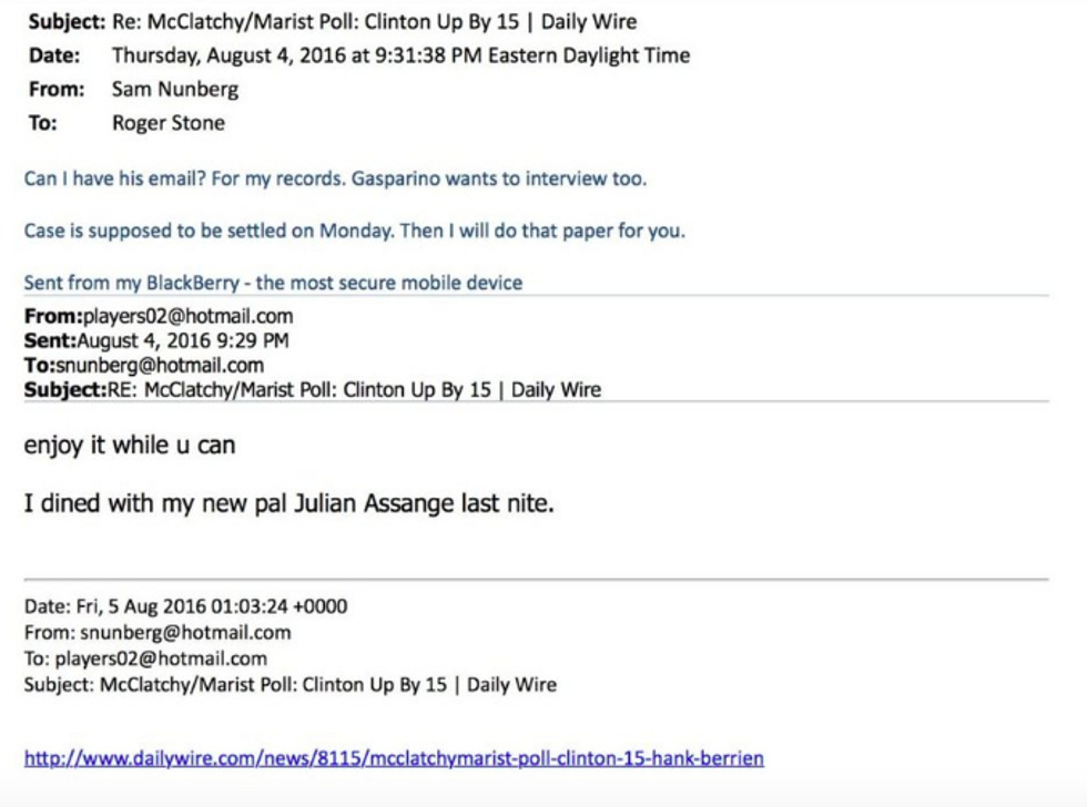 He has similarly forgotten all about reaching out to Ted Malloch and asking him to hit up the stinky hacker at his Ecuadorian hideaway. Also, too, his email telling Stone that the next Wikileaks doc-dump would hit the Clinton Foundation.