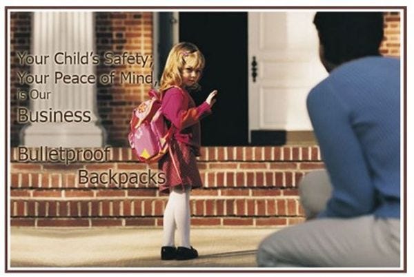 Look, yr Wonkette is not naïve. Nut jobs shoot up schools and we want to protect our kids. Of course, nut jobs also shoot up malls, movie theaters, coffee shops…hell, is there a category of public or private space in America that hasn’t been shot up by some angry sociopath? How is giving your first grader a head start (heh) on a raging case of PTSD a reasonable and rational way to live? It’s not. It’s ridiculous. We hope some millionaire buys up America’s entire supply of these backpacks and hands them out to schoolkids in Iraq and Afghanistan and Syria. And maybe inner-city Chicago, where we’re betting not too many parents have a spare $250 to blow on one of these things. Sadly, in those places, bulletproof backpacks make sense.