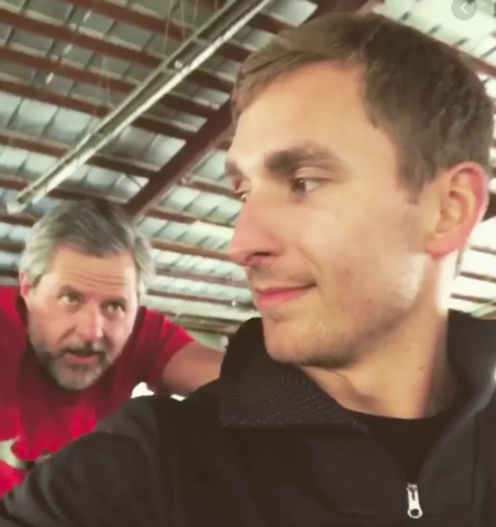 News came out on Monday that, according to a strapping young man named Giancarlo Granda, he had an affair for more than six years with Jerry and Becki Falwell wherein he and Becki would do traditional Christian heterosexual fucking while Jerry grunted in the corner and we assume did traditional Christian onanism to his ween. It wasn't long after that it was announced Jerry would be leaving his post as president of Liberty University, which he was already taking a break from because of that Instagram picture with the non-wife lady where you could see his panties.
