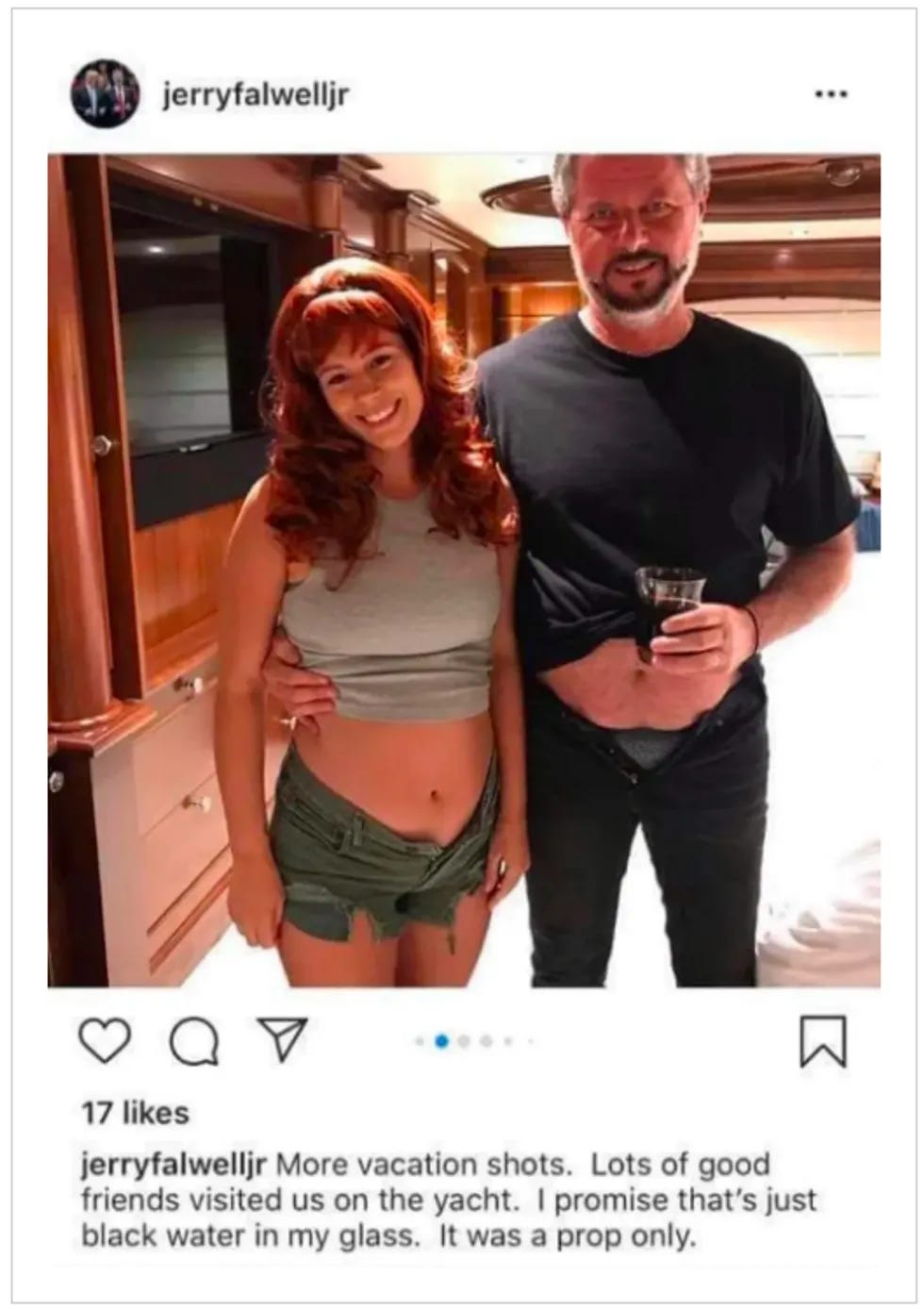 Also, “Dr. Falwell valued the importance of forgiveness in Christianity,” unlike those rat bastards on the board who throw a guy overboard just because his wife is evangelical bonezoning the poolboy. It’s a weird take for a guy who tried to sic the FBI on members of the board for conspiracy to hack into their own emails, but Jerry is nothing if not committed to the bit.