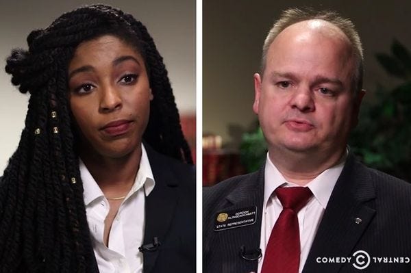 Jessica Williams, one of the Daily Show's most effective weaponized comedic assets, gets sent on a search, mock, and destroy mission to take on the idiocy of "bathroom bills" like those recently passed in North Carolina and Mississippi, legislation so awful that even conservadarling Nikki Haley thinks it's stupid. Williams even manages to sit down for an interview with Colorado state Rep. and outrageous self-parody of a rightwing preacher Gordon Klingenschmitt, apparently because he doesn't have any self-awareness at all. (Haha "apparently.") This is prime Daily Show stuff, kids: Explain the issue, interview some reasonable people who have been hurt by terrible bigoted legislation, then let the bigots speak for themselves. After speaking to Meagan Taylor, a trans woman who was jailed for eight days in Iowa after checking into a hotel with a photo ID identifying her as "male," Williams seeks the opinion of an advocate of "trans panic," the demon-obsessed Klingenschmitt, whom she introduces as a "Colorado representative and Elmer Fudd Lookalike." It's funny 'cause it's true!