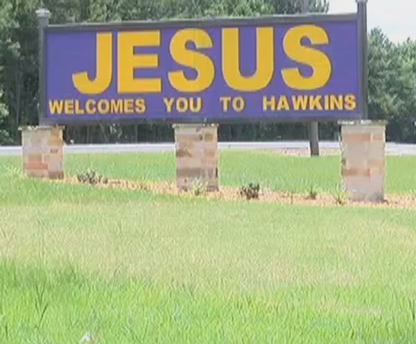 The mean liberals at the Freedom From Religion Foundation have found their latest target, and it is the innocent residents of Hawkins, Texas, who really like the big ugly-ass sign they have at the entrance to town that says "Jesus welcomes you to Hawkins." What's the problem? Oh, it's on city-owned land, which means the city is endorsing Jesus as a deity, when they are supposed to remain impartial, according to that quaint little thing called the United States Constitution. But hold on a minute, according to the mayor, this is FINE, because Jesus is not welcoming people in a RELIGIOUS way. It's more because Jesus is so popular -- guess he just likes to greet people, like at Walmart: