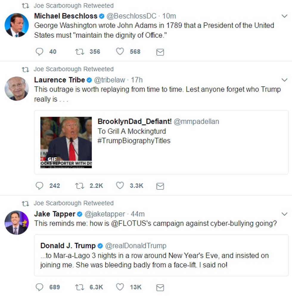 Joe Scarborough, Mika's beloved, is responding in his own way, just retweeting things he finds interesting, you know, totally for unrelated reasons: