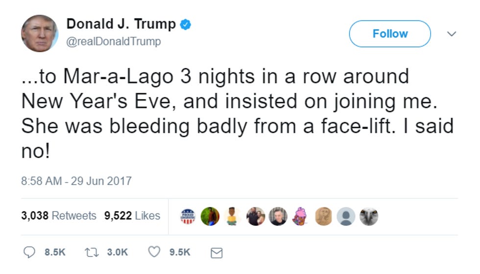 And does Donald Trump really want to bring up plastic surgery? Because during the campaign, the Daily Beast reported on a 1993 book, Lost Tycoon: The Many Lives of Donald J. Trump, written by Harry Hurt III, that details a deposition in Trump's divorce from Ivana Trump that explains what allegedly happened when Donald Fucking Trump was allegedly recovering from a little plastic surgery of his own, an alleged procedure that obviously he should get a refund for, since he's still the motherfucking ugliest man on the planet (not allegedly):