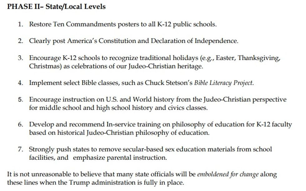 How seriously should anyone take this thing? Whatever plans CNP has for reshaping America, it seems to be infested with at least some of the same attention to detail we've come to expect from the Trump administration and DeVos's Department of Education: The very first paragraph of the cover page looks forward to the coming "leadership of Mrs. Becky DeVos Secretary-Designate." Assuming the USA doesn't manage to go Full Gilead anytime soon, the actual "reforms" are unconstitutional cowflop, and the plan itself isn't particularly different from any number of aspirational "How We'd Fix The Schools For Jesus" agendas.