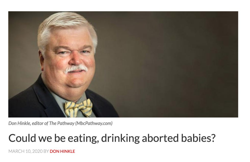 Over on the Christian site The Pathway, Editor Don Hinkle — a "saved" Southern Baptist Minister who was the "top news writer" in the Department of Defense in 1981 (according to his bio) — is very concerned about baby eating. So concerned that he published an article on Tuesday titled "Could we be eating, drinking aborted babies?"