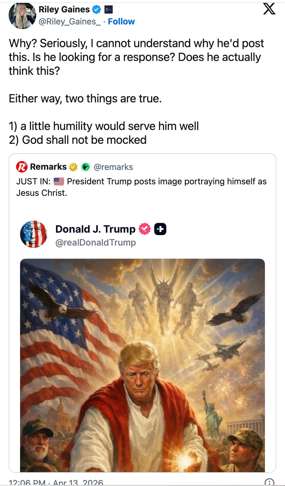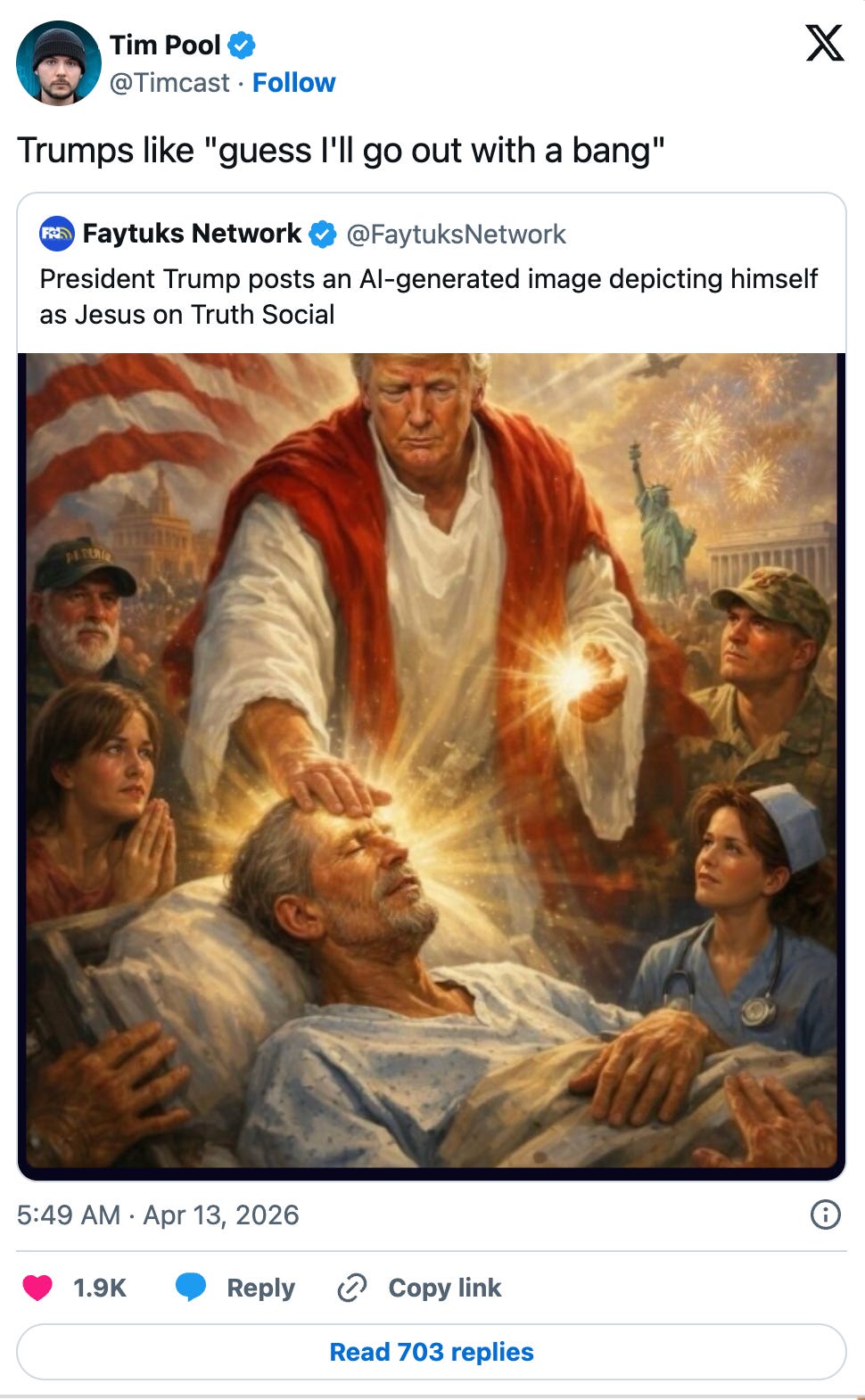 Sean Feucht, that completely bonkers MAGA pastor, tweeted, “This should be deleted immediately. There is no context where this is acceptable.” Later, he made sure to emphasize that he still knows where his bread gets buttered (it is with Trump’s dick), tweeting still that Trump should delete it but “Does Trump legitimately think he’s Jesus to America? No.” So that’s pathetic.